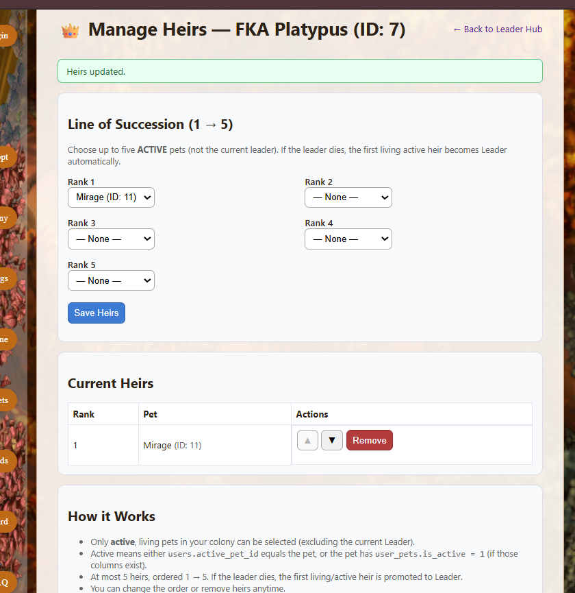 --added in Hiers- you can choose up to 5 active pets to become the leader in the event of the leaders death-