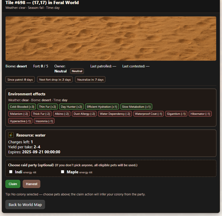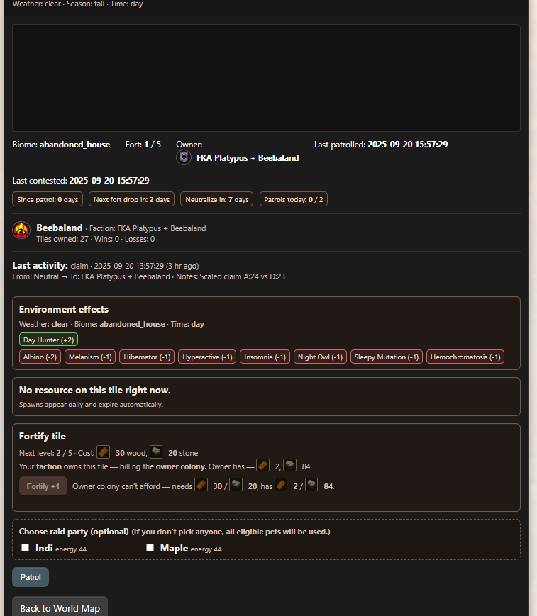 --Did alot of work on the territory/world map and the features for that.. I know theres probably still some issues with it.. but yea... Feel free to check out the wiki for info on it! And theres a link to it in the colony page but yea i know ts still kinda acting up I know lol! Im working on it! and do tell me what you find thats acting up because its working for me! I have to get off though because its going to storm and i dont wanna fry my computer i need it to code!
