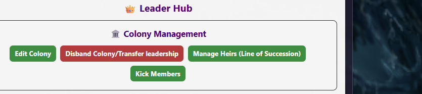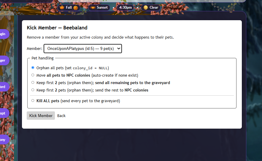 --added the kick members area to the leader hub- you can now kick out troublesome members and if you want to teach them a lesson, by killing off the pets they earned in your colony or simply shipping them off somewhere else!
