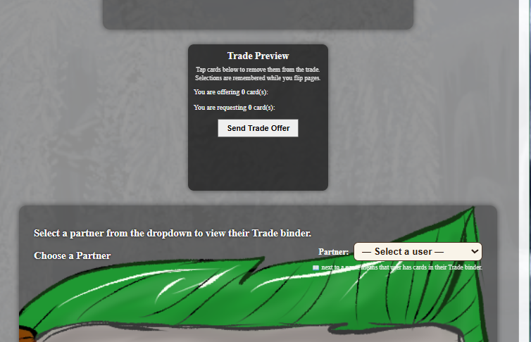 --Added more card images to the card shop and some more variations and pretty stuff. you can now also TRADE cards. there is now a trading card binder. the top is yours, middle is the preview, bottom is the Other persons. if they have a book icon next to their name they have cards to trade.