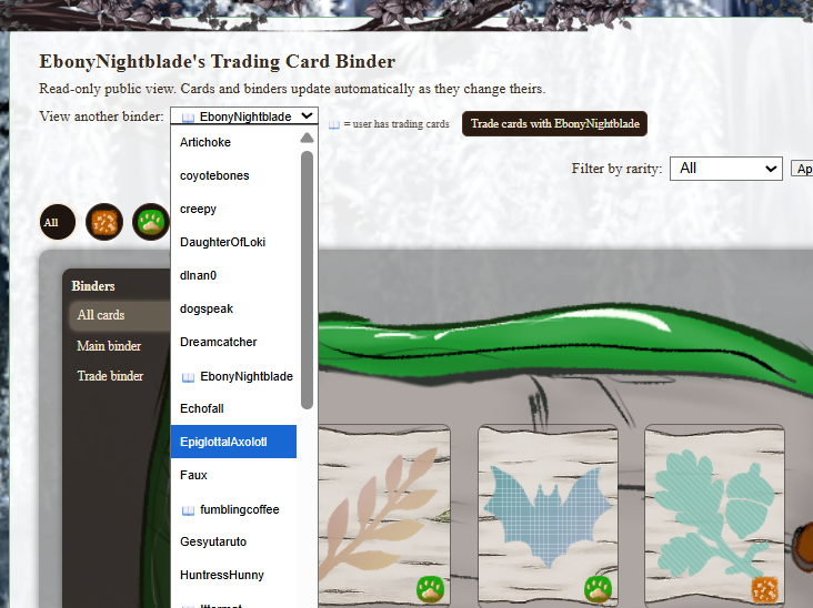 --You can also see a public view of a users binder from their profile and there is a dropdown on their binder to see another users book icon means they have cards..