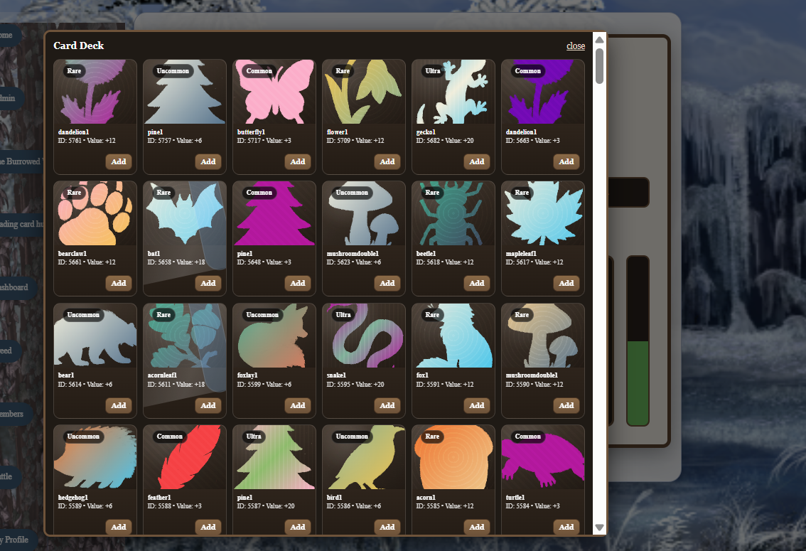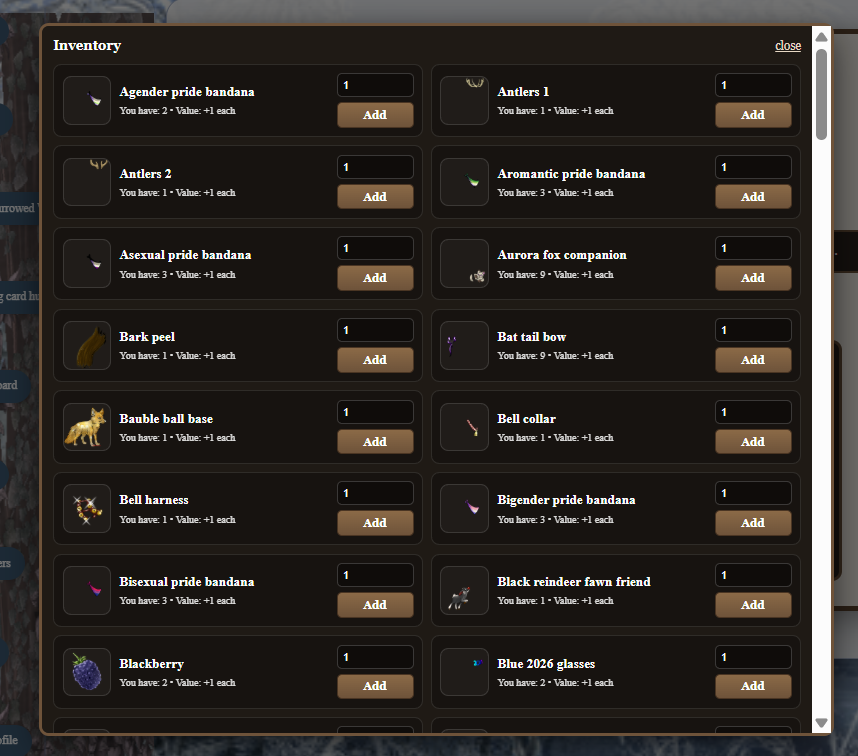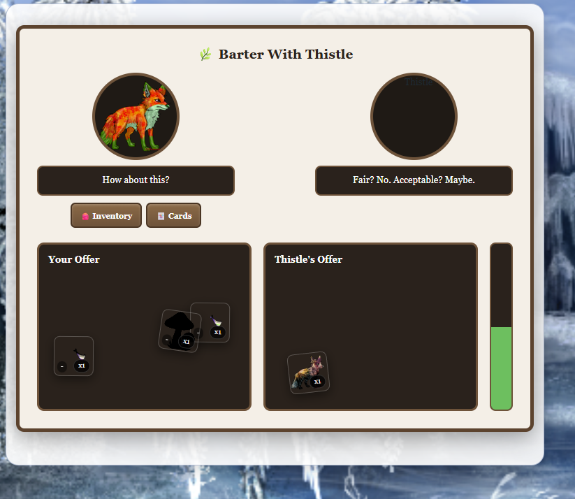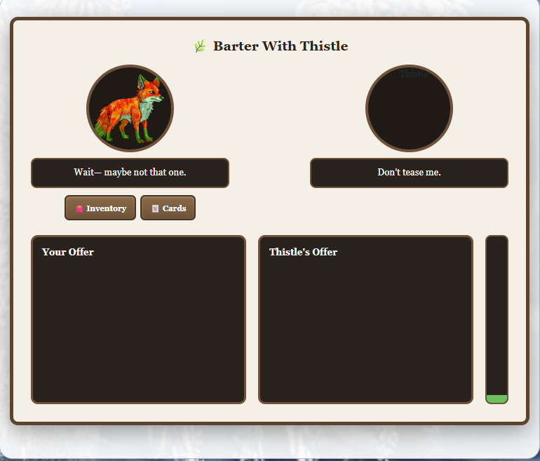 --Made a bartering system with Thistle (yes I know his images are missing working on them at least the page seems to work! lemmme know if it doesnt! read more info about it here! you get to it through the trading card hub!