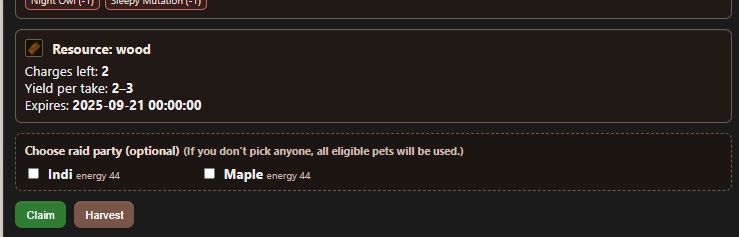 []Some tiles spawn resources: 🪵 Wood, 🪨 Stone, 🍖 Meat, 🌿 Herbs, 💧 Water. each day on rollover.